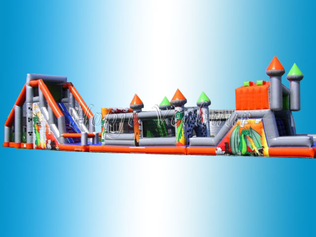 Wil je veel indruk maken op je deelnemers? Dat doe je met deze mega grote base jump en grote stormbaan van maar liefst 21 meter lang! Het is een uitdagende stormbaan die is ontworpen in een spannend draken thema, wat de beleving helemaal compleet maakt. Wie bereikt als eerste de overkant van deze opblaasbare hindernisbaan in draken thema? De strijd kun je winnen door vliegensvlug te kruipen, rennen, springen, klimmen en glijden op dit dubbele parcours. Hiermee wordt die sportdag of dat zeskamp één groot feest!