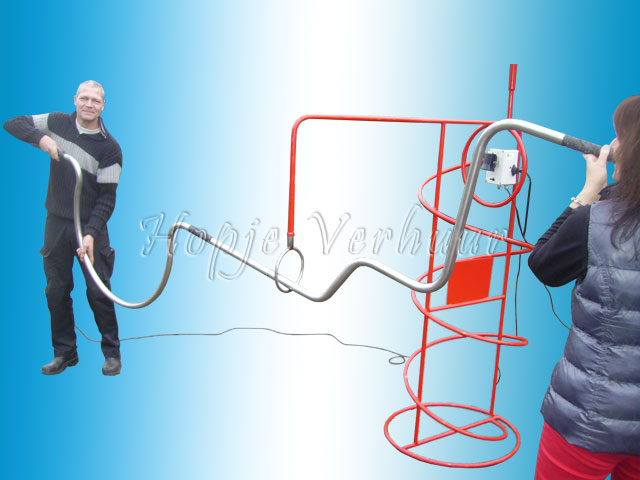 Reuze spiraal andersom. Probeer met 3 of 4 personen de spiraal van 4 mtr lang door de ring te manoeuvreren zonder dat de zoemer gaat, veel succes.