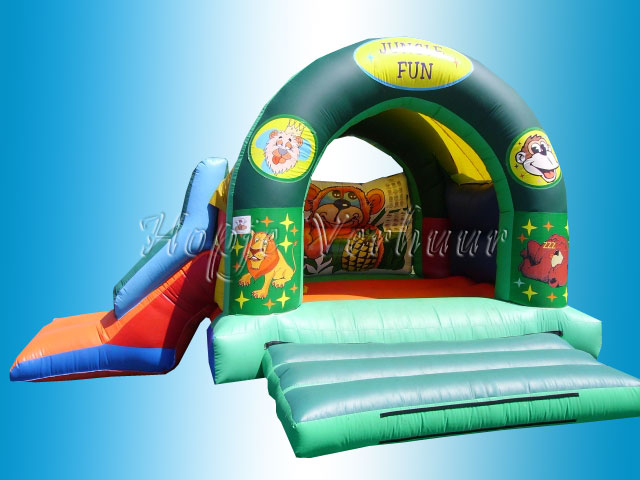 Met de opblaasbare jungle multifun met jungle thema zorg je voor urenlang speelplezier. De midifun, heeft een glijbaan en is ideaal voor bijvoorbeeld kinderfeestjes of buurtfeestjes. De midi jungle heeft vrolijke felle kleuren en op de wanden zijn leuke animaties afgebeeld.
